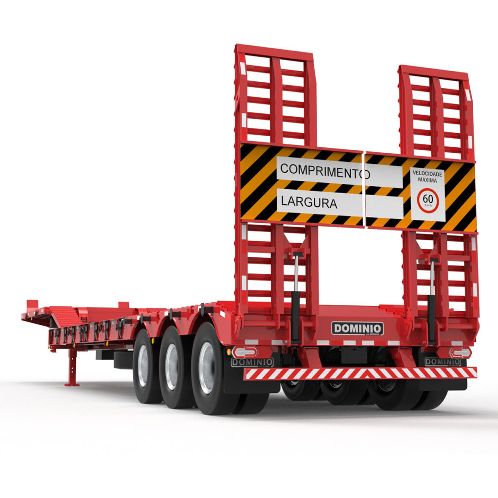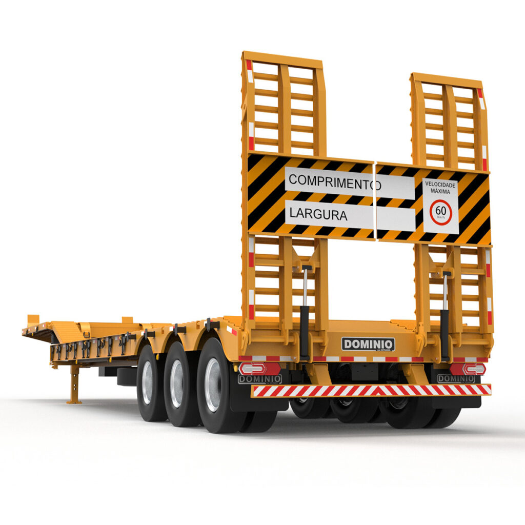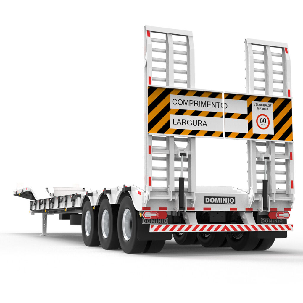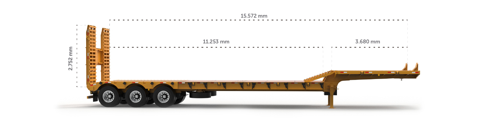 Chassi construído em perfis de aço estrutural com longarinas viga “I”, travessas passantes e fechamentos laterais perfil em “U”. Pino-rei flagelado 2” (50,8mm), conforme NBR 5548. Apara-barro de borracha na traseira. Para-choque fixo conforme resolução CONTRAN 152/2003 e Portarias 11/2004 e 18/2007. Instalação elétrica 24 (LED), conforme normas do CNT. Apoio de levantamento manual com alças e pinos removíveis para regulagem de altura.
