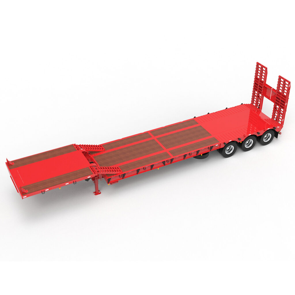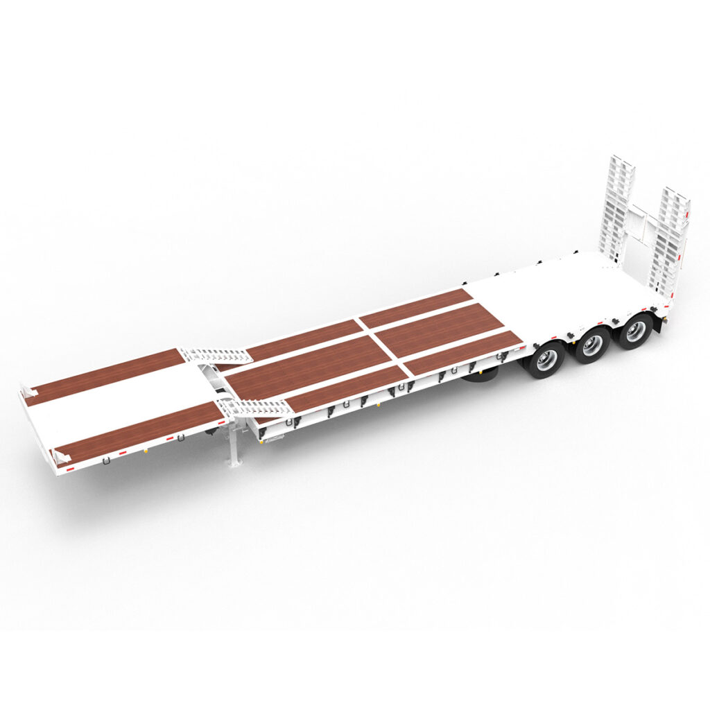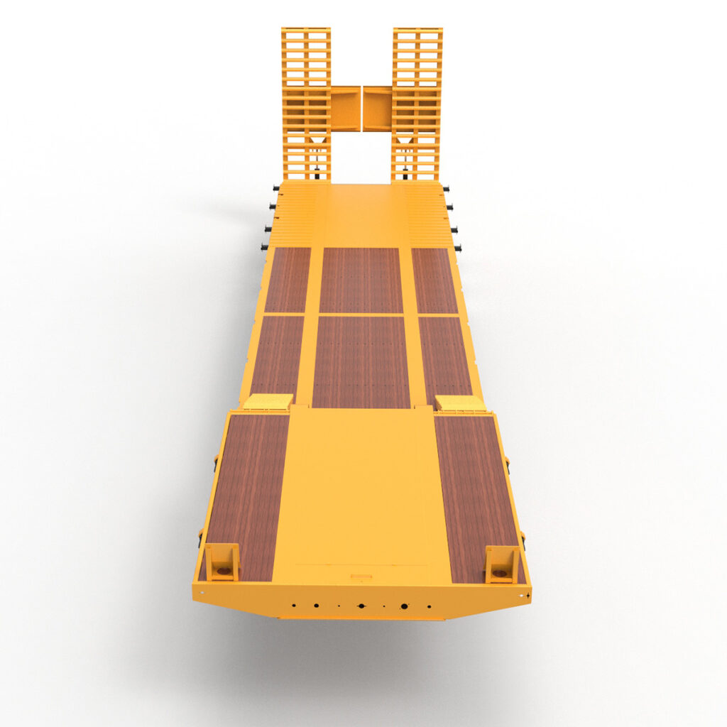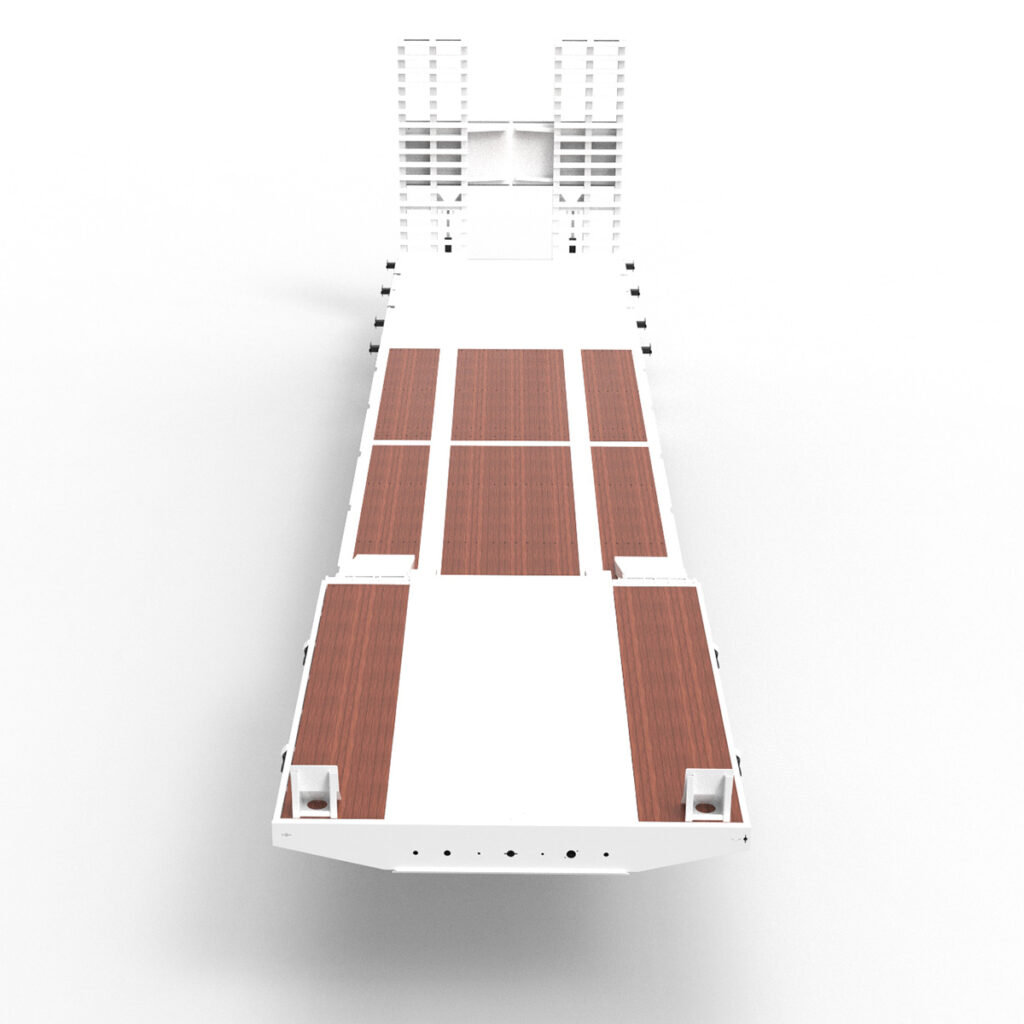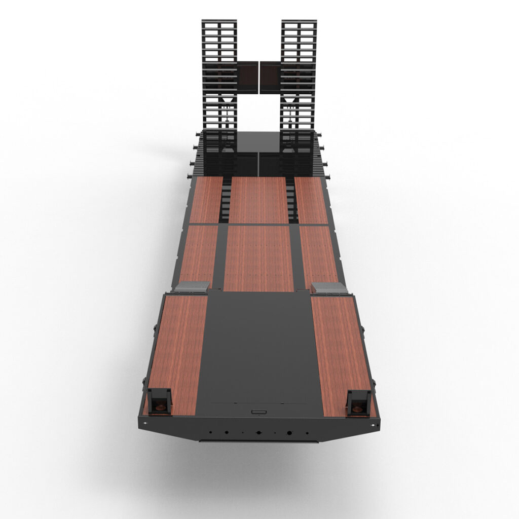 Piso em madeira de lei espessura 500 mm (na plataforma útil), chapa na cobertura dos pneus, argolas de amarração de carga fixadas no perfil lateral, 3000 mm de largura.
